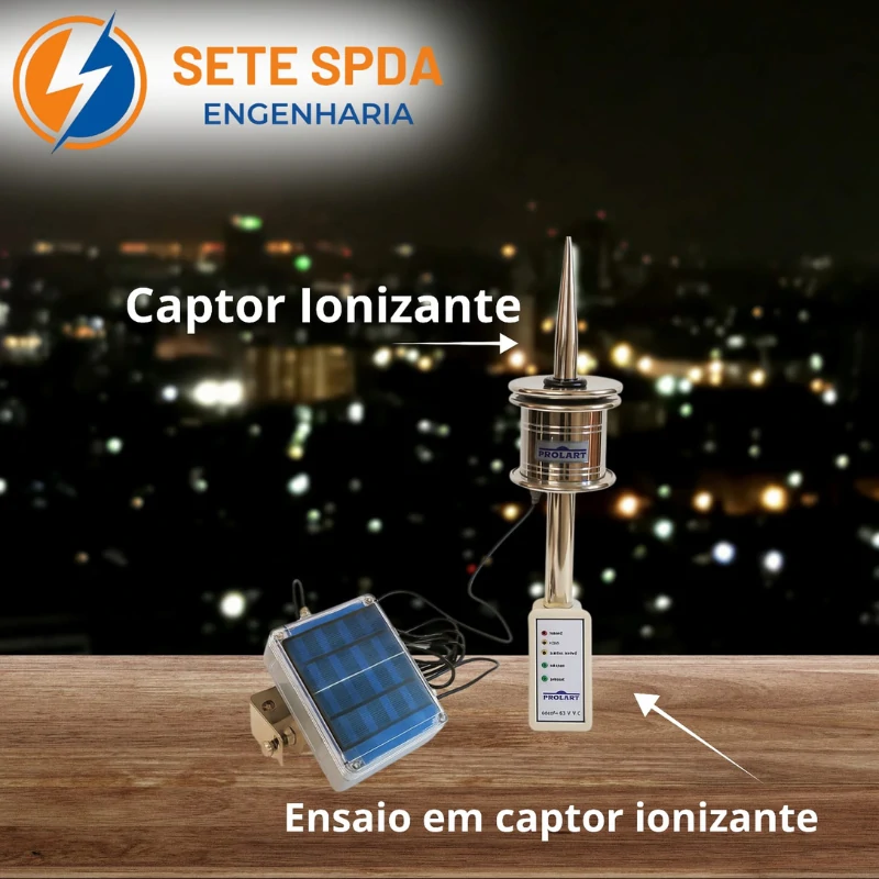A empresa utiliza captores ionizantes, uma tecnologia que emite íons para criar um "caminho preferencial" para o raio. Isso aumenta a área de proteção e antecipa a reação à descarga. As inspeções para esses captores são semestrais (visuais) e anuais (completas), com a emissão de laudos técnicos.